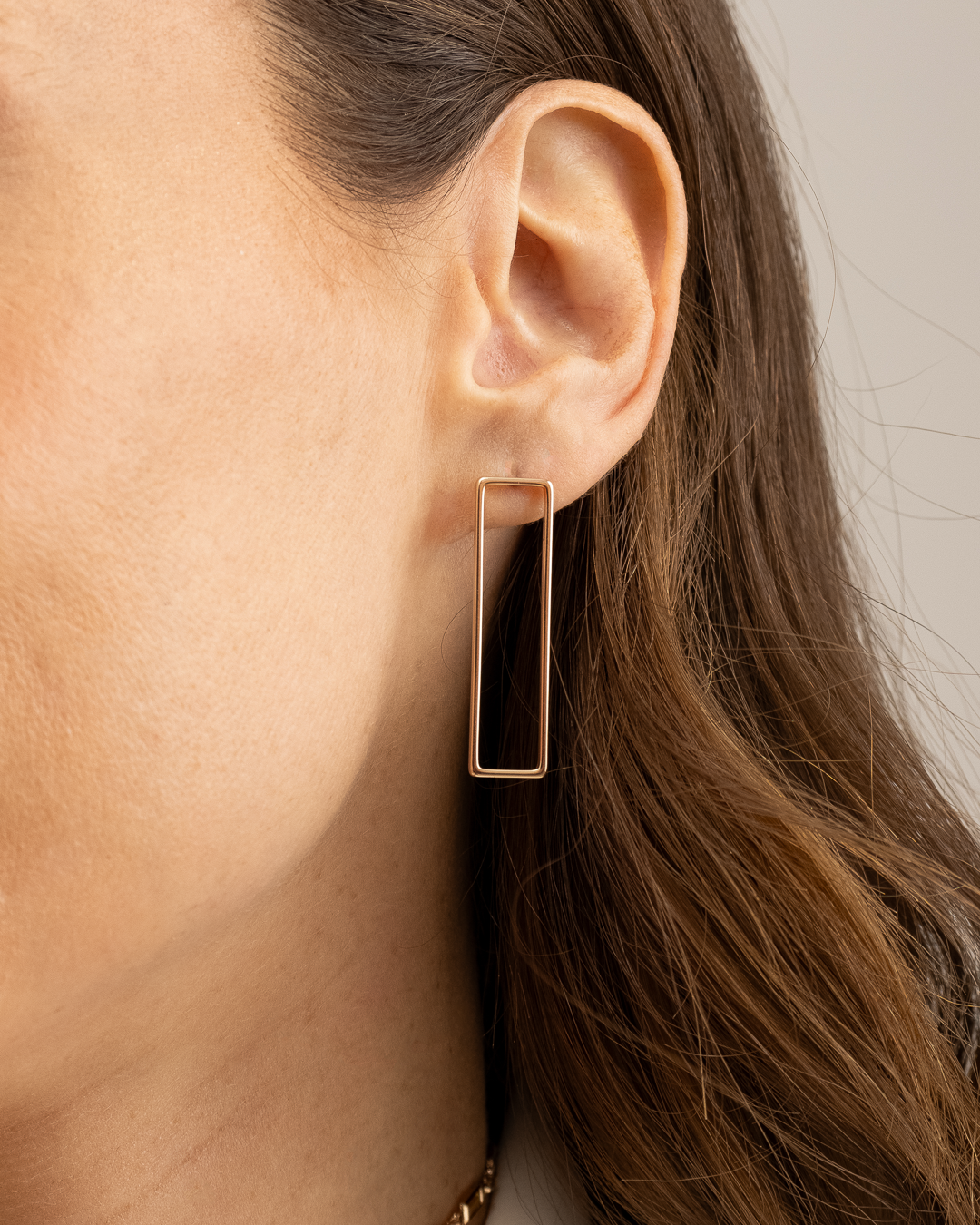 Brinco alongado retangular folheado a ouro 18K hipoalergênico. Semijoias finas de qualidade e design diferenciado você só encontra na Stilla. Maxibrinco marcante e moderno, perfeito para dar destaque ao rosto.