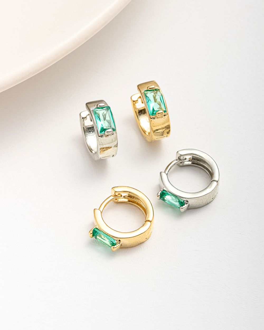 Brinco de argola click com zircônia verde retangular folheado a ouro 18K hipoalergênico. Semijoias finas de qualidade e design diferenciado você só encontra na Stilla. Brinco delicado e diferenciado.