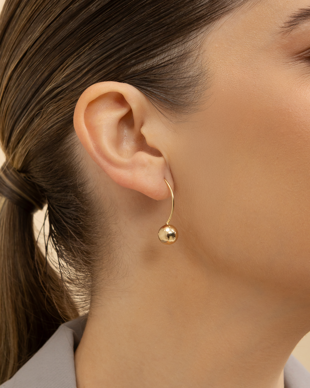 Brinco de gancho bola na ponta folheado a ouro 18K hipoalergênico. Semijoias finas de qualidade e design diferenciado você só encontra na Stilla. Brinco versátil e imponente.