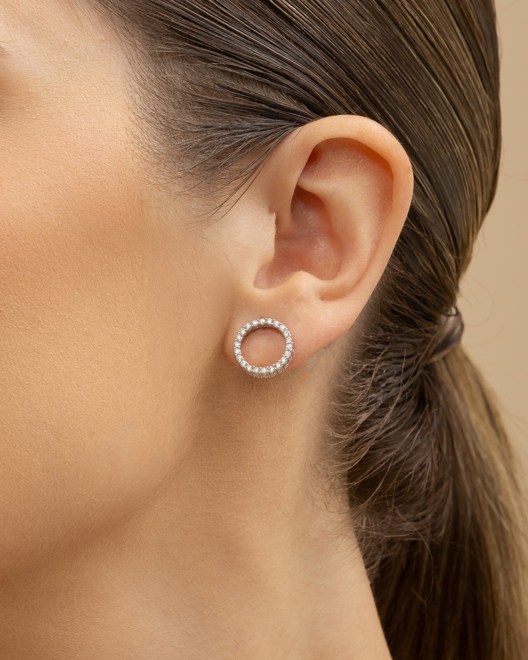 Brinco de zircônias cravejadas círculo vazado detalhe galeria banho de ródio hipoalergênico. Semijoias finas de qualidade e design diferenciado você só encontra na Stilla. O brilho da zircônia ilumina o rosto de forma elegante.