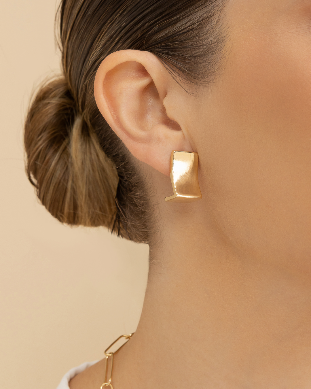Brinco maxi retangular abaulado folheado a ouro 18K hipoalergênico. Semijoias finas de qualidade e design diferenciado você só encontra na Stilla. Brinco marcante, perfeito para presentear.
