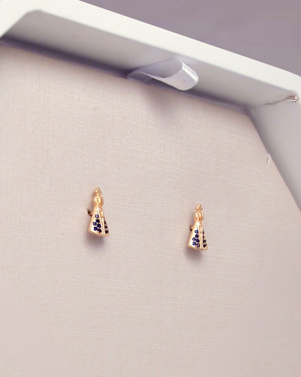 Brinco Nossa Senhora Aparecida zircônias azuis cravejadas folheado a ouro 18K hipoalergênico. Semijoias finas de qualidade e design diferenciado você só encontra na Stilla. Perfeito para presentear.