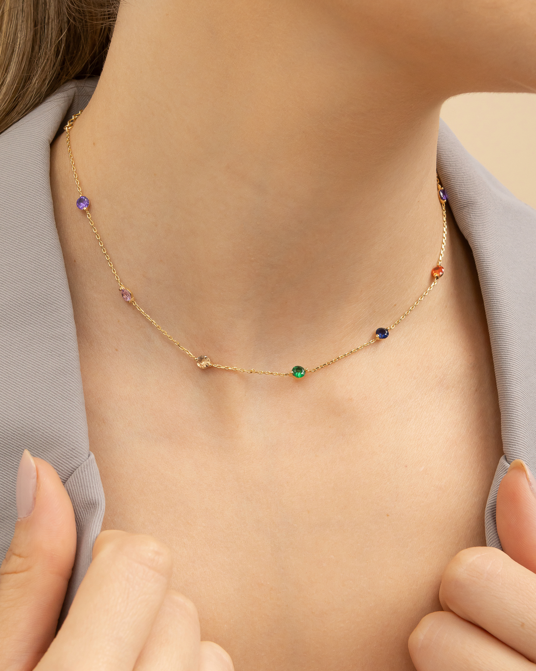 Colar delicado com zircônias coloridas espaçadas folheado a ouro 18K hipoalergênico. Semijoias finas de qualidade e design diferenciado você só encontra na Stilla. Um colar delicado e fácil de combinar com seus looks.