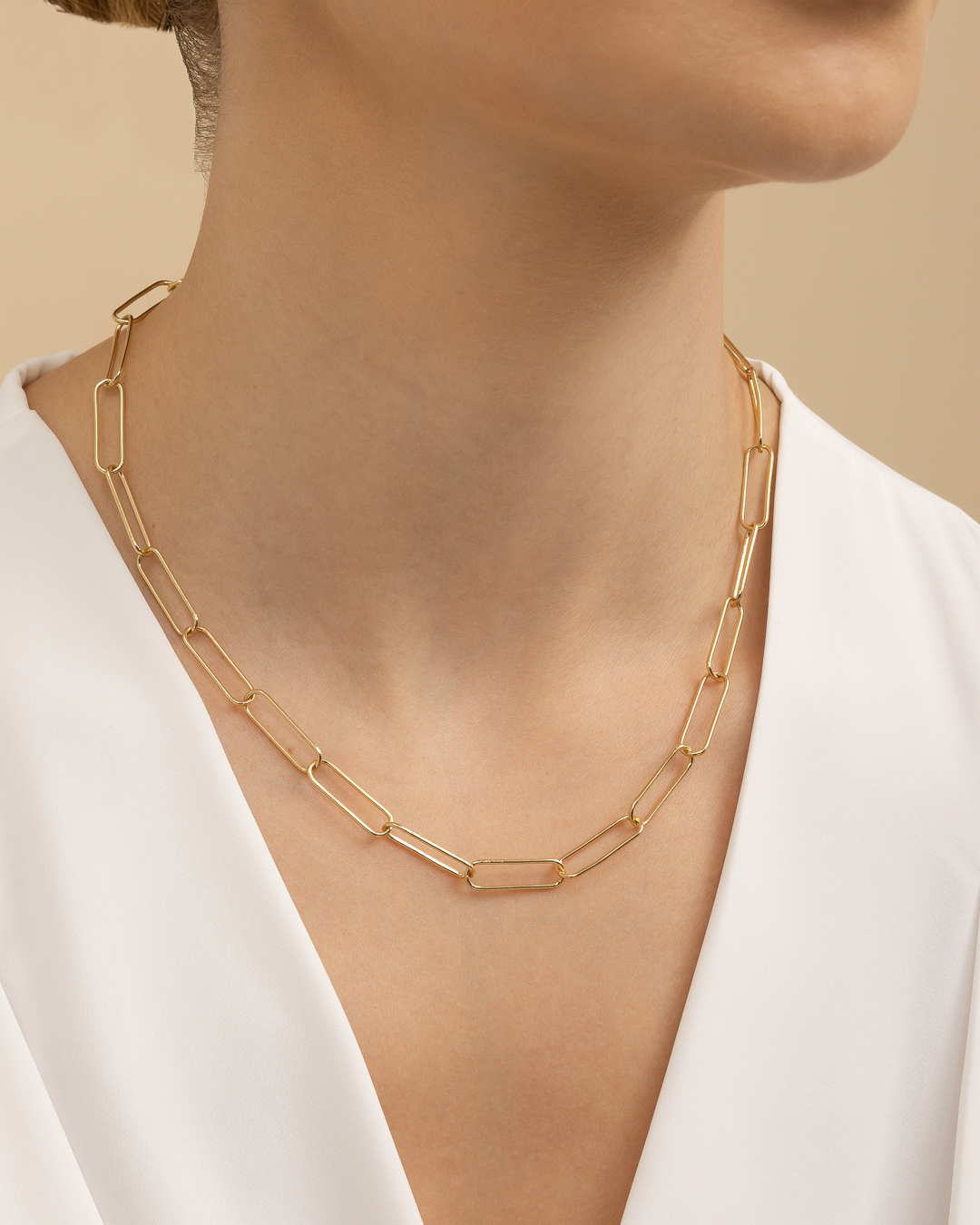 Colar elos alongados folheado a ouro 18K hipoalergênico. Semijoias finas de qualidade e design diferenciado você só encontra na Stilla. Um colar delicado e fácil de combinar com seus looks.