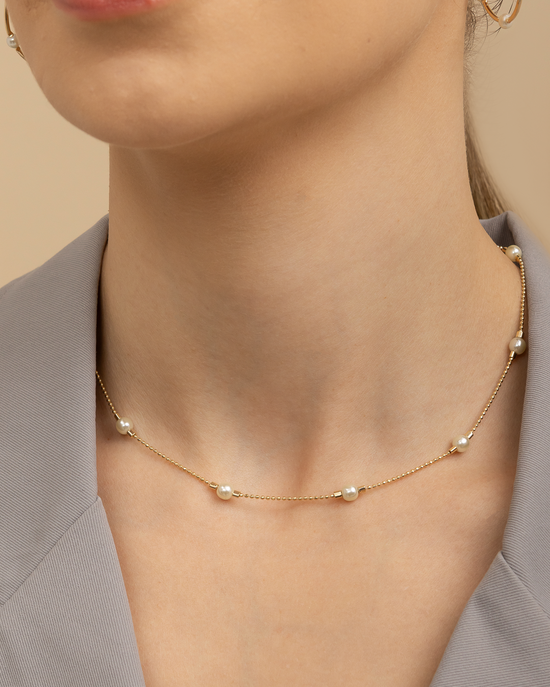 Colar pérolas espaçadas com corrente de bolinhas folheado a ouro 18K hipoalergênico. Semijoias finas de qualidade e design diferenciado você só encontra na Stilla. O colar de pérola é sinônimo de elegância e requinte.