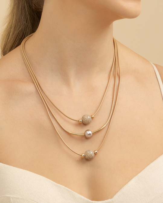 Maxicolar 3 voltas pérola rosé e craquelada sintética folhado a ouro 18K hipoalergênico. Cordão de algodão cru. Semijoias finas de qualidade e design diferenciado você só encontra na Stilla.