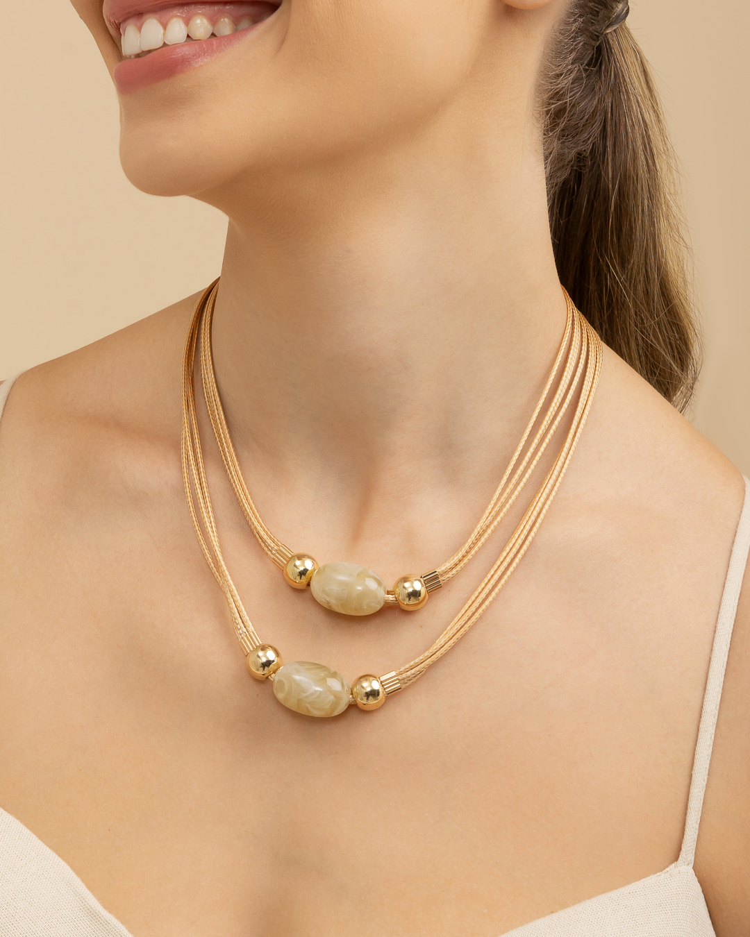 Maxicolar nude duas voltas robusto pedra oval clara folheado a ouro 18K hipoalergênico. Cordão de algodão e pedra sintética. Semijoias finas de qualidade e design diferenciado você só encontra na Stilla. O maxicolar imprime personalidade, por isso é o protagonista em looks modernos.
