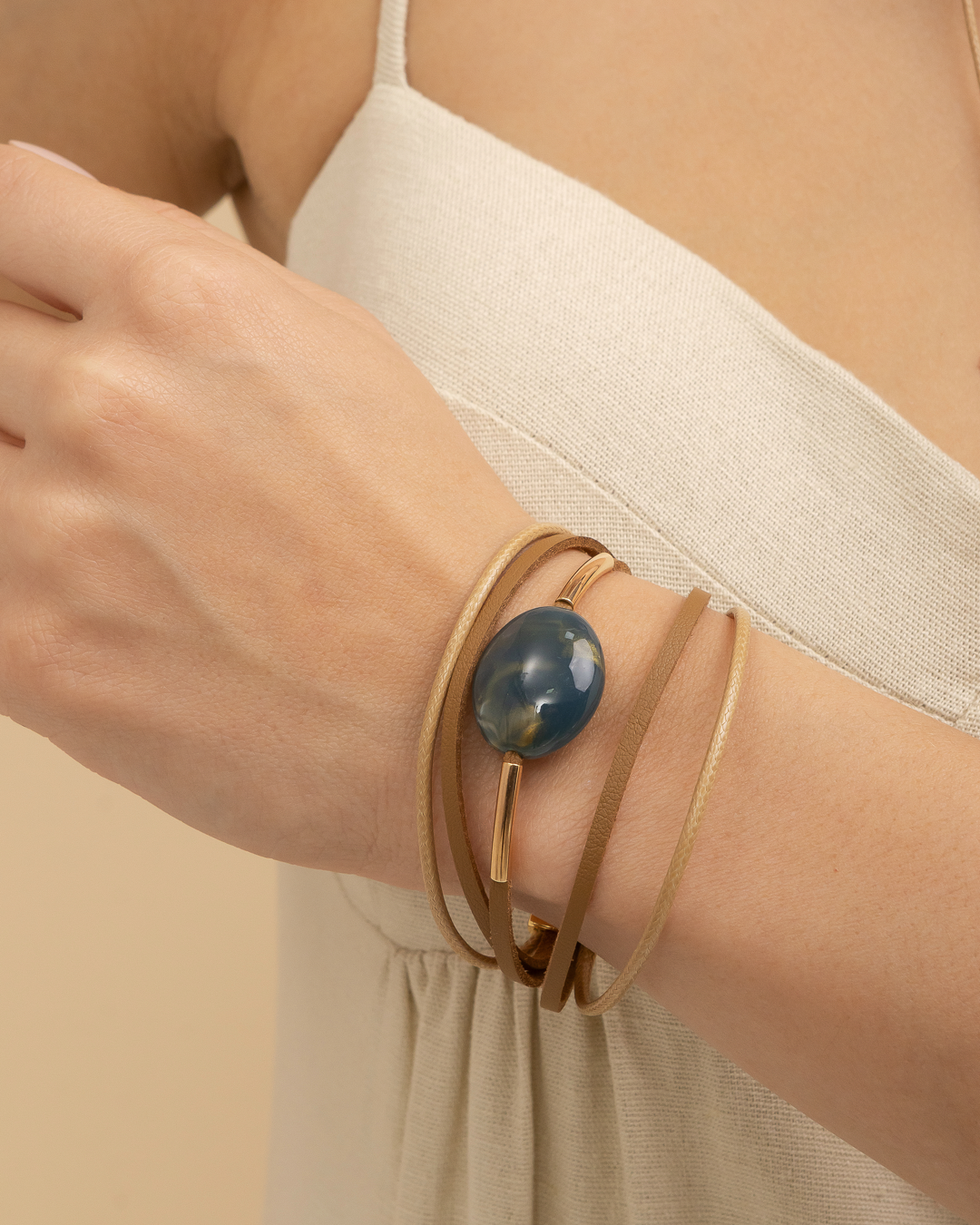 Pulseira pedra azul petróleo translúcida marmorizada folheada a ródio hipoalergênico. Pedra sintética e cordão de algodão. Semijoias finas de qualidade e design diferenciado você só encontra na Stilla. As pulseiras femininas em couro e com fecho de ímã são modernas e práticas, fáceis de colocar e tirar, elas imprimem personalidade e muito estilo ao look.