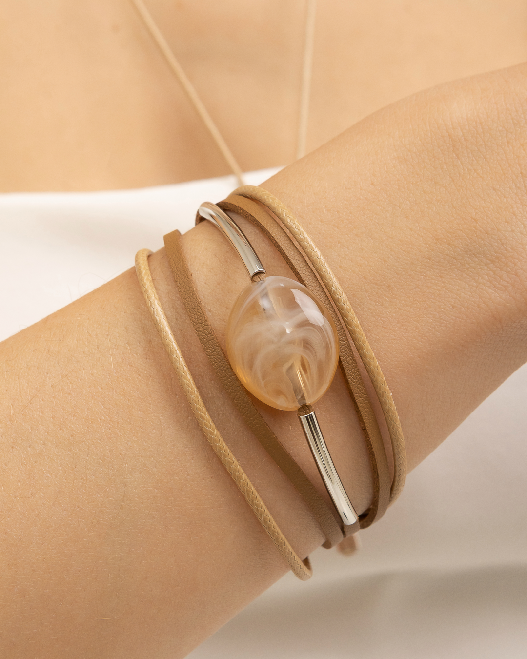 Pulseira pedra nude translúcida marmorizada folheada a ouro 18K hipoalergênico. Pedra sintética e cordão de algodão. Semijoias finas de qualidade e design diferenciado você só encontra na Stilla. As pulseiras femininas em couro e com fecho de ímã são modernas e práticas, fáceis de colocar e tirar, elas imprimem personalidade e muito estilo ao look.